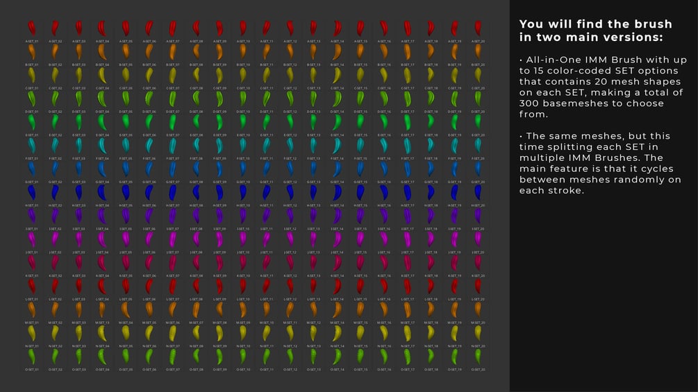 In this pack, you’ll receive an All-in-One IMM Brush featuring 15 color-coded fur styles, each with 20 unique mesh shapes (a total of 300 meshes). You’ll also get the same collection split across multiple brushes, each cycling randomly through its meshes on every stroke for organic variation.