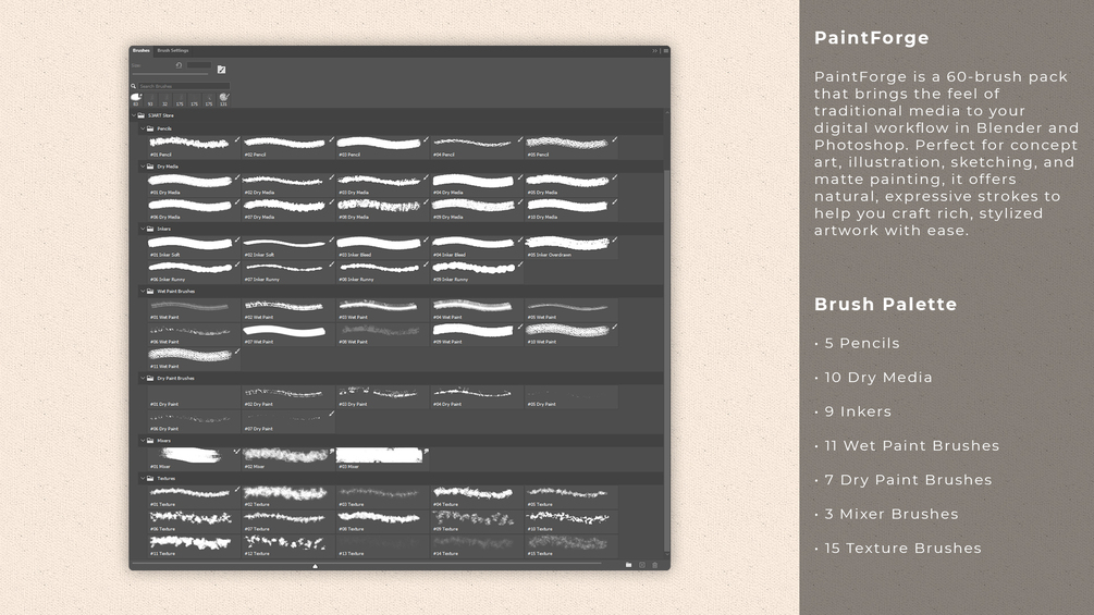 Elevate your digital art with PaintForge, a versatile brush collection that authentically reproduces the tactile feel of traditional media. Whether you’re sketching concept art, crafting detailed asset textures, or laying down broad strokes for matte paintings, these brushes give you the responsive feedback and natural textures of real-world tools – right in your favorite software.
